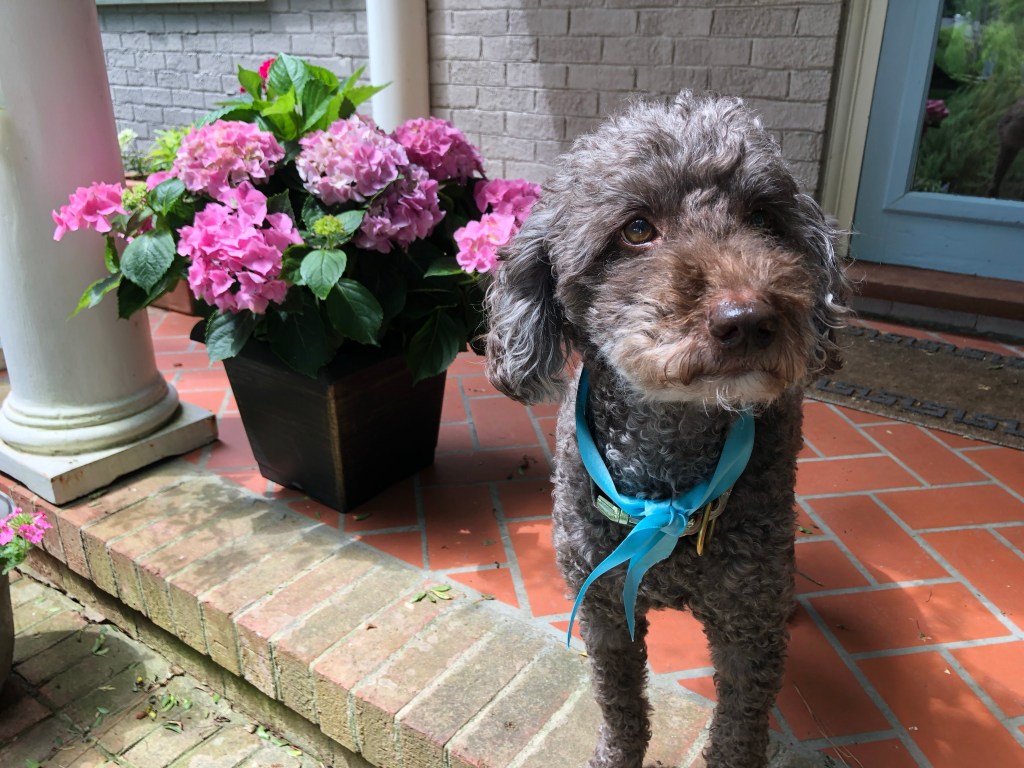 Shay was particularly sad to see them go. She loved having two dog lovers to fawn all over her. She put the blue ribbon on that came with the gifts Claire brought. It looks particularly good with her brown coat and her pink Hydrangeas.