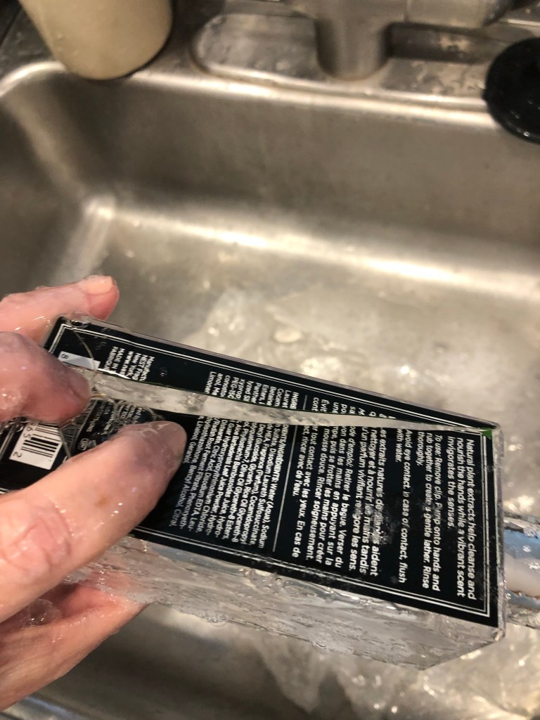 I turned the box upside down and carried it to the kitchen counter quickly. Many ounces of liquid hand soap had already coated the inside of the box. It had covered the boxes of the gifts inside what were not bubble and plastic wrapped, but just thrown in the cardboard box in open top plastic bags. There were two small pillows of air, hardly enough to hold the four heavy glass candles from shifting, crushing one of the two large plastic bottle of hand soap.