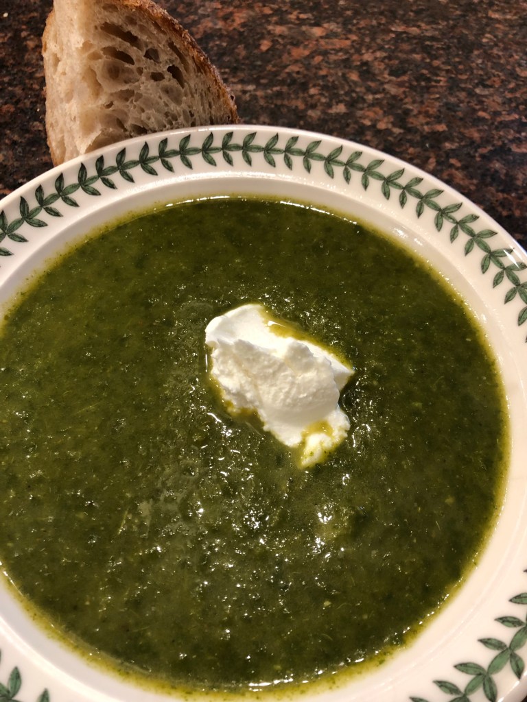 I have a bunch of spinach and a bed of arugula that we have not eaten quickly enough and they are bolting. The arugula gets spicier the larger it grows so I decided to make a soup tonight utilizing both greens and some cilantro from the garden I need to use up before it turns to seed.