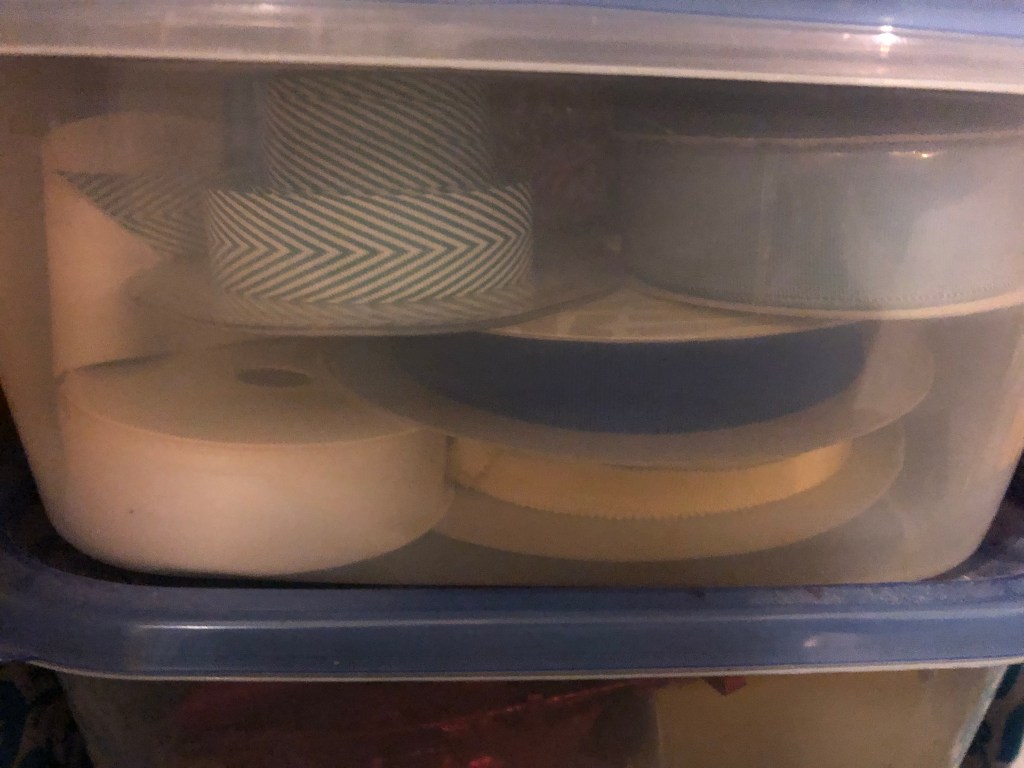 Today I cleaned out my wrapping closet and discovered that I had eight extra large plastic containers of ribbons and bows. Some are single strands and others are whole rolls of ribbon. I guess that I am going to need to start giving a lot more gifts with a lot more ribbons on them to use up my entire stash of ribbons. These 8 bins are not the entirety of all the ribbons in the house, but I did not dare look to consolidate all the sewing room ribbons, needlepoint ribbons, Christmas ribbons and scrapbook ribbons into one closet. For that I would need a good sized RV.