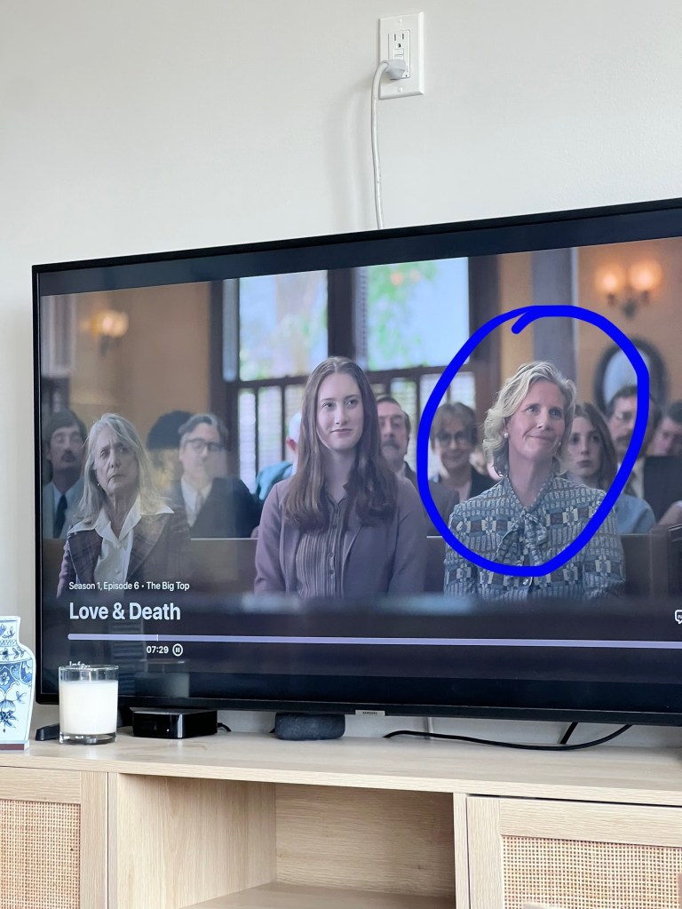 I came home from class to watch the latest episode of “Love and Death” on HBO. Carter watched it this afternoon and sent me a photo of my cousin Meredith who was a member of the jury on the show. So fun. A wide ranging day.