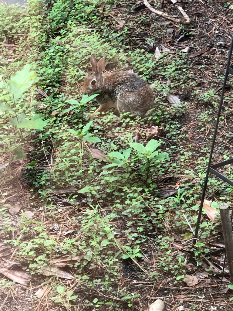 In the meantime there are just a few volunteer plants and weeds that keep coming up. Not a worry because Shay’s bunny brigade come in to be the ground’s crew. They nibble away on most anything that is growing there in the comfort of the small space, protected from hawks.