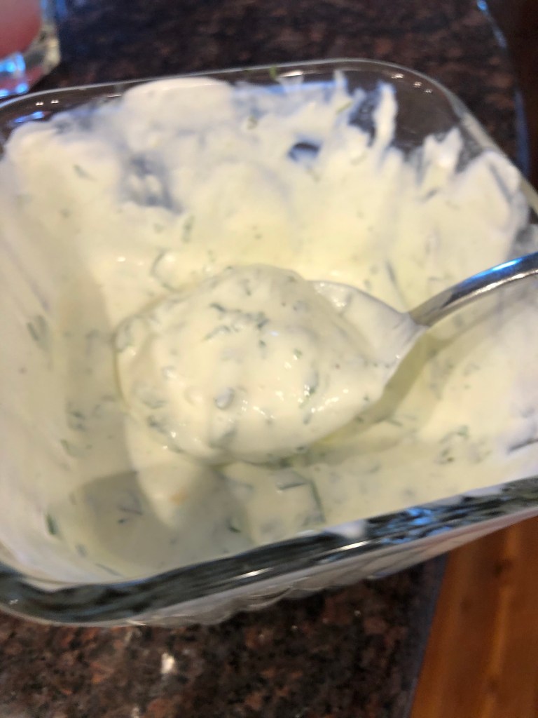 The real reason to make them was to be able to make an herb sauce. I have many herbs in my garden and I like to use as many of them as possible while they are still young and tender. Tonight I cut a handful of chives, basil and oregano. I pulled all the leaves off the stemmed herbs and chopped it all up together. I had about a third of a cup of the minced greenery. To that I added a heaping spoonful of mayo and three spoonfuls of sour cream, juice of half a lemon and a good sprinkle of garlic powder.