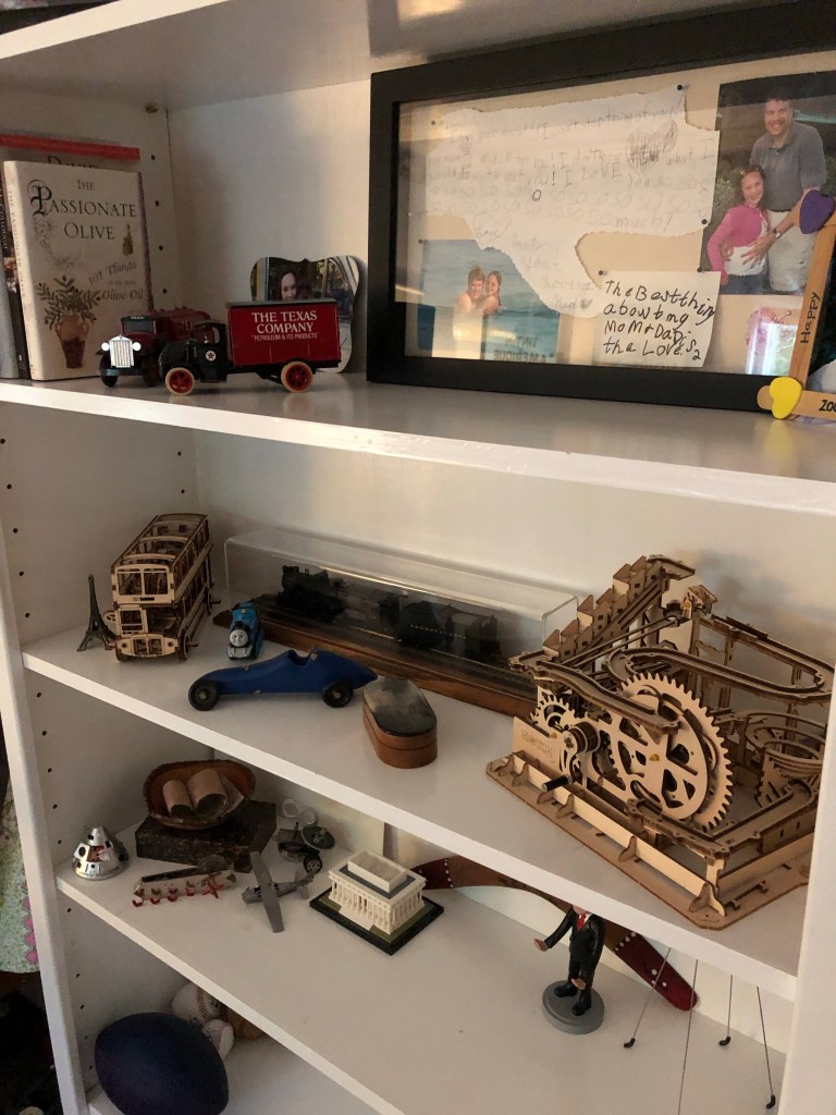 He did a good job with all these treasures, like three old flip phones, a bobble head likeness of himself that his team had given him, old metal piggy banks and mementos from Carter, which I put back on the shelves. We pared the books down to ones he loved and did away with odd balls that people had given him and he had no interest in. It took an inordinate number of dust rags to clean everything, but I think his lungs will thank me. He still has his eccentric collection of mechanical toys and wind up moneys, but it will be much easier for me to dust.