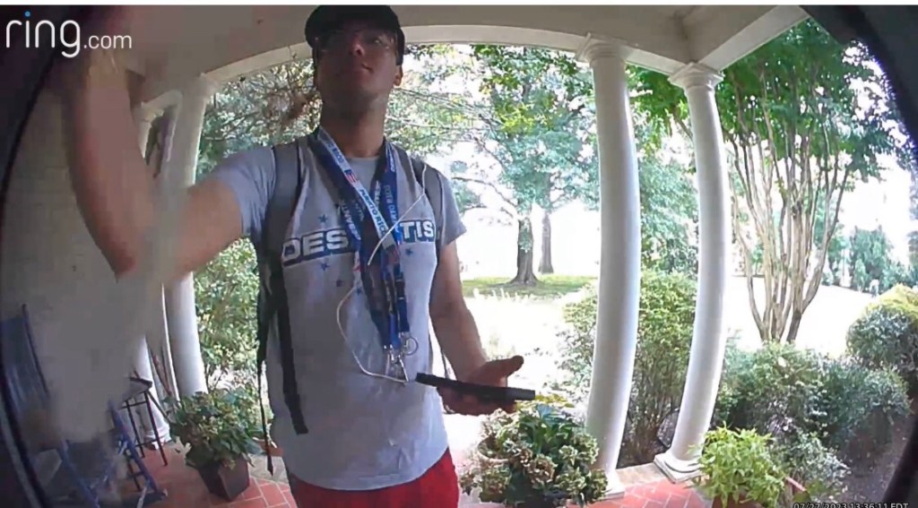 The young man at the door was wearing a DeSantis shirt, hat and lanyard with some badge.