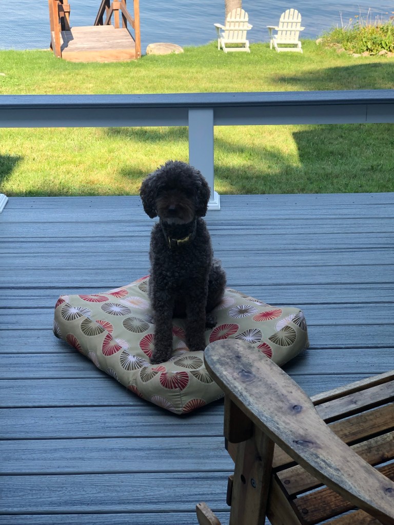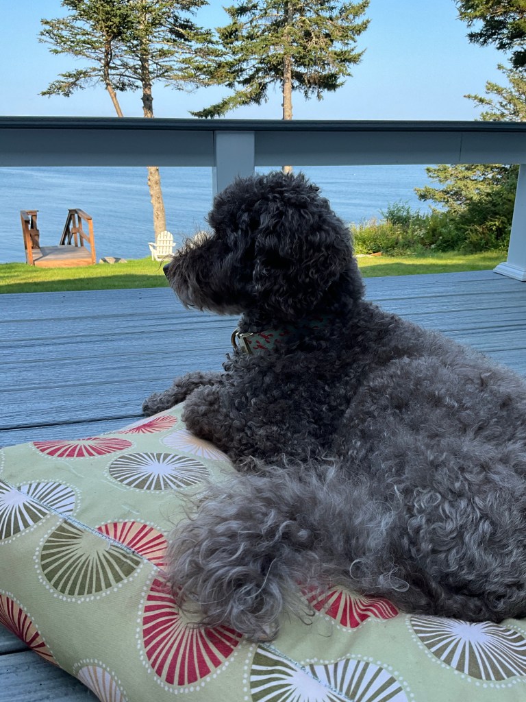Posted: August 21, 2023 Filed under: Uncategorized Leave a commentOf the three of us I am the best at vacationing. Daddy has worked most of the day. Mommy has done errands, but I have fully been on vacation. I have spent my time going between sleeping on my outdoor bed while Daddy is on calls and sleeping on my indoor bed while Mommy is needlepointing.