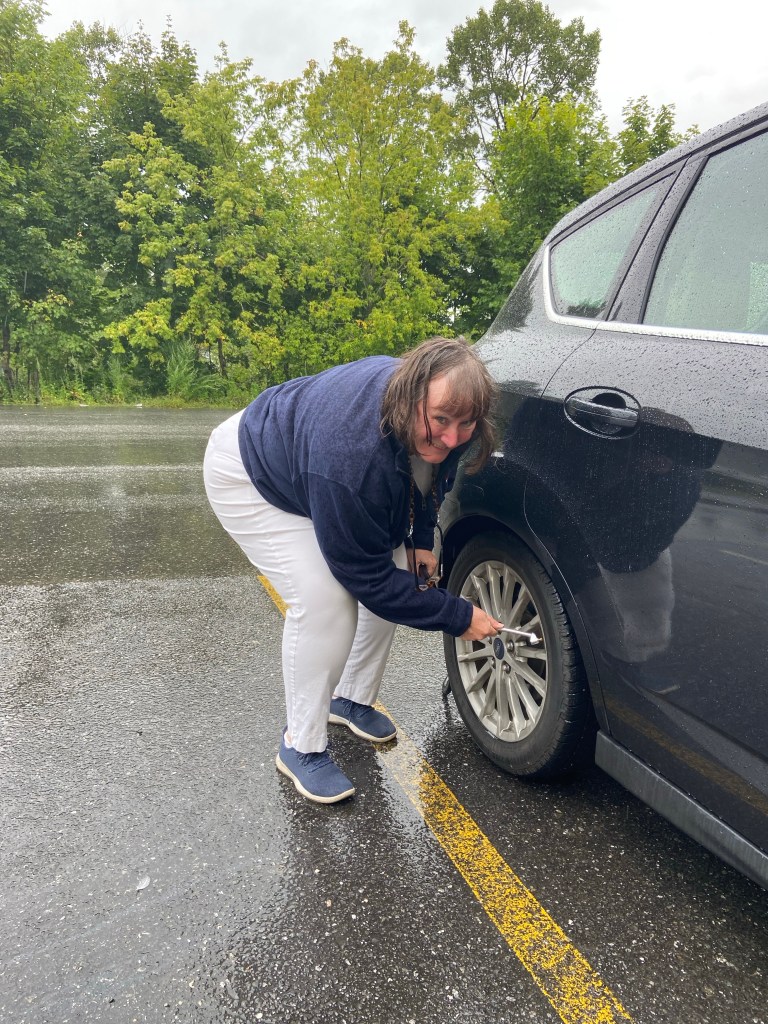To be safe we pulled into the first gas station and drove around the whole thing until we found the air. It’s $1.50 for 3 minutes of air these days. I remember when air was free! So we looked at all the tires and took the caps off to be ready to fill them up. It was raining so this was a miserable task. It took 9 minutes worth of air to make sure the tires were OK. Thank goodness I have a husband who believes you should have a tire gauge in the glove box. Karen took a photo of me filling the tires and when she went to look at it could not stop laughing at what a horrible photo it was. I told her the more horrible the more likely I am going to post it.