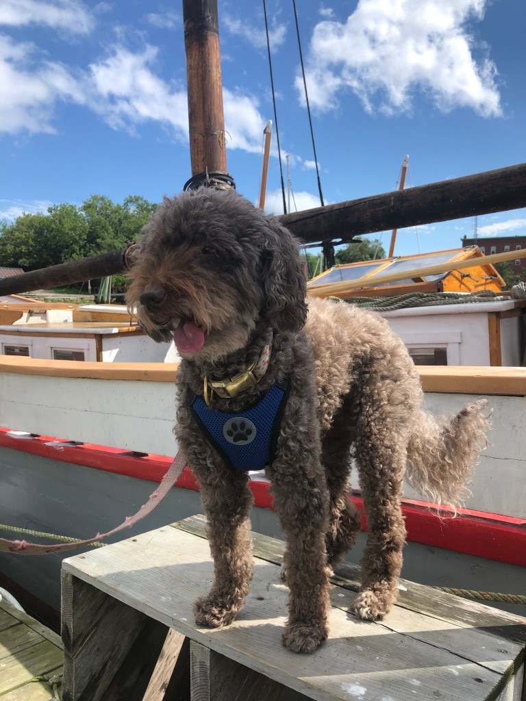So for now I’ll just look cute and nautical. Not actually be nautical. I would not mind coming back to see the bigger ships when they come in because the people who work on those boats are nice to puppies as most people in Maine are. Please don’t tell any of them that I can’t swim and don’t like to go on boats. They can just think I look cute next to boats. That is enough.