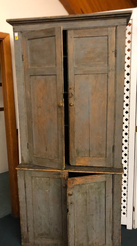 As a charity auctioneer I like to help out and bid things up if I like them. This put me in good standing with Bruce. I did win two lots. One a blue antique cupboard and one corner cupboard that was not antique, but fabulous and goes perfectly with my dining room furniture. I got one at less than half the estimate and the other for a fifth of the estimate. Good thing since I have to ship them. In my opinion the estimates were low.