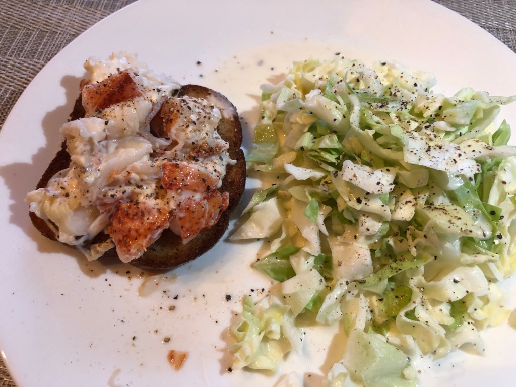 I brought those lobster’s home and picked them and ended up with a huge bowl of meat, enough for two or three meals. For dinner I made my own homemade lobster “roll” with gluten free bread I grilled in the frying pan. It was the best lobster I have had all summer. Russ said I probably liked it better because it was also a deal. I think it was the way I dressed it with a touch of mayo and a lot of lemon and black pepper. The coleslaw made with the Beth’s cabbage was also better than anything else we have had.