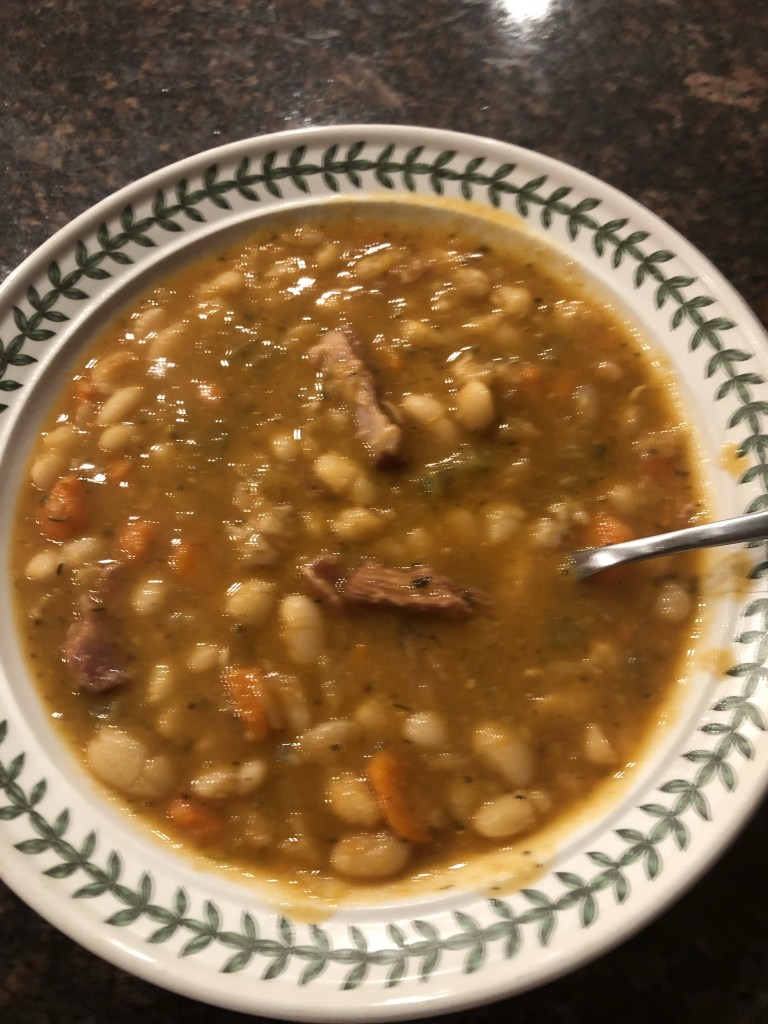 In anticipation I made navy bean soup tonight. Russ was all prepared to eat the leftover Thai green curry chicken I made night before last, but when he saw the soup he went with that.
