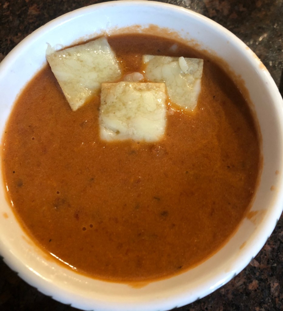 I actually had time to make a repurposed cream of stewed tomato soup. When we got home from church I cooked down some chopped onions and carrots with some chicken stock. Added the leftover stewed tomatoes and some half and half and, voilà, soup. I melted a little Gruyère on gluten free crackers and had lunch, which appeared to Russ as new food.