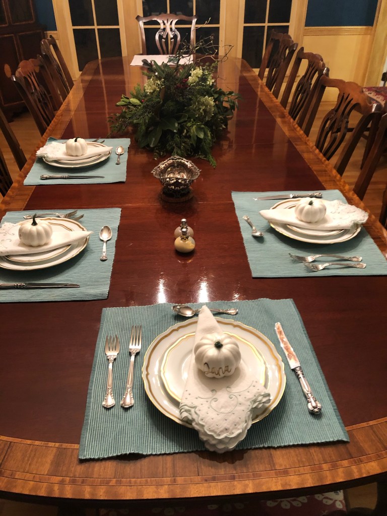 Carter then went back to work and made the mashed potatoes and then set the table. She pulled out my wedding china and some napkins I got for my wedding but never use since I only have four of them. Thanks to Jane Brothers I have a beautiful center piece.
