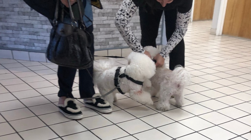 A very frail elderly woman came in the vets with her two well groomed but ill behaved Bichons. Each was on their own retractable leash. Neither paid one bit of attention to what their human was asking of them. Not that she asked forcefully.
