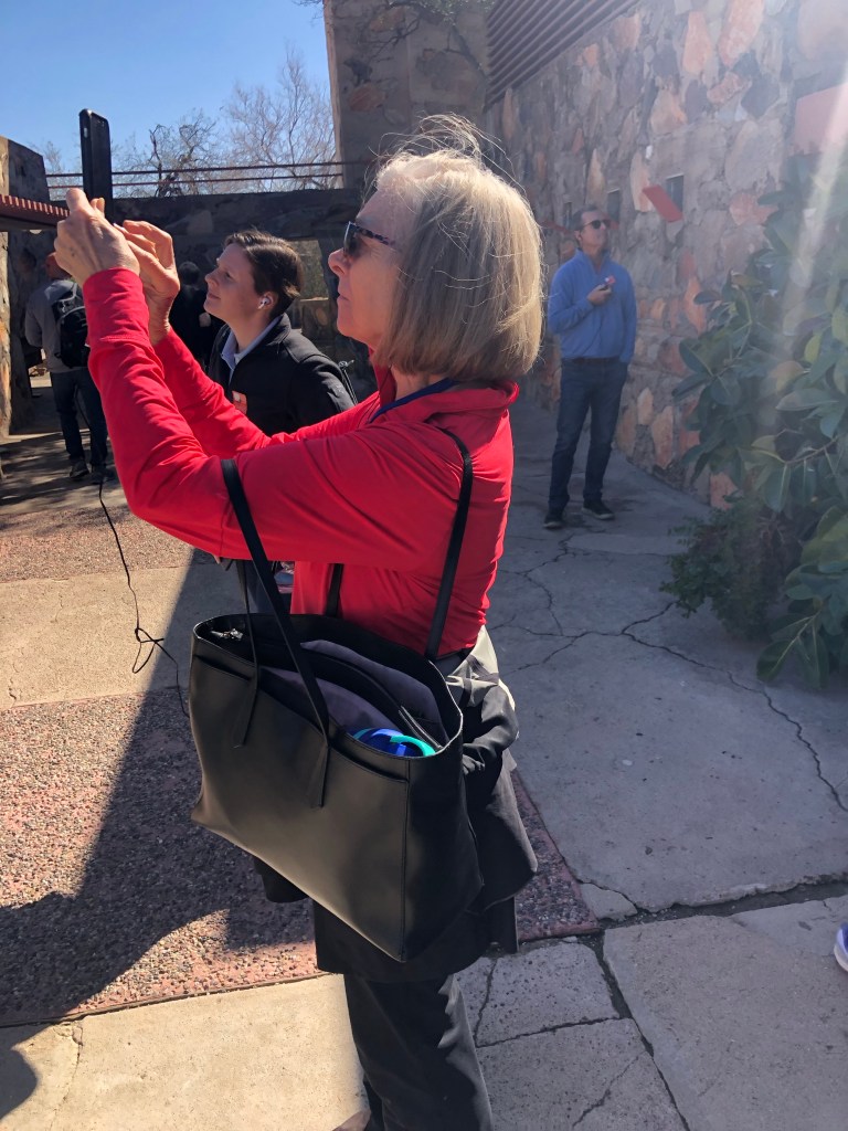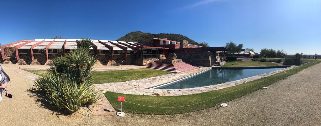 We saw Wright’s office and the pool. The landscape is spectacular and the dessert is green right now as they got rain last week. Each listening to our own tour, we sometimes would get a little out of sink. As one person might finish the lecture on the living room and move on the the dinning room, another of us would still be only halfway the living room presentation.