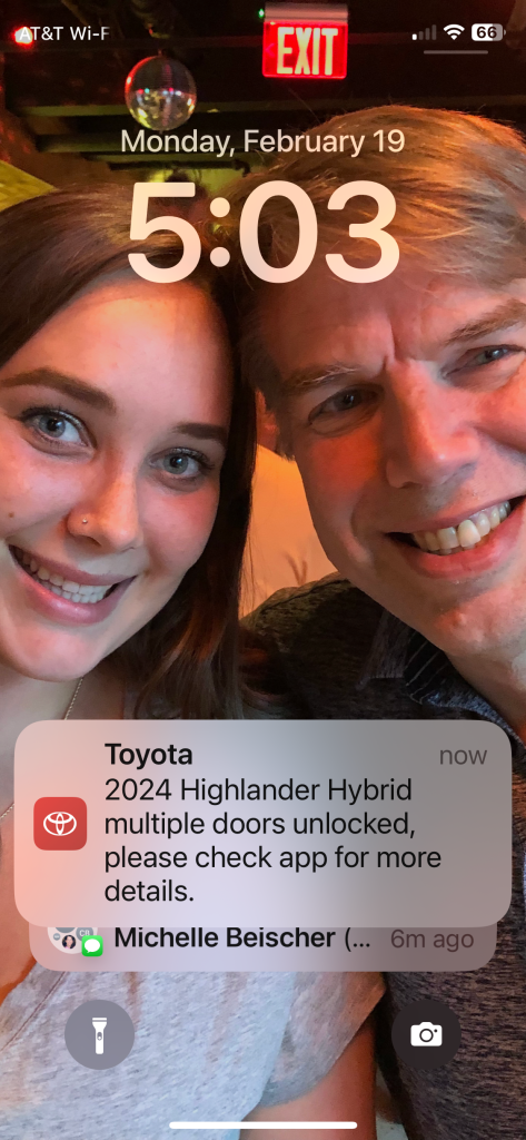 When we got home from Russ’ inaugural drive we just went in the house. Once there I got a text on my watch telling me multiple doors on the car were left unlocked. I pulled up the app and was able to lock the doors from my phone. My watch confirmed they were all locked and that the car was parked in the driveway. Thank goodness all my devices are talking to each other and to me, I never will be lonely with this car.
