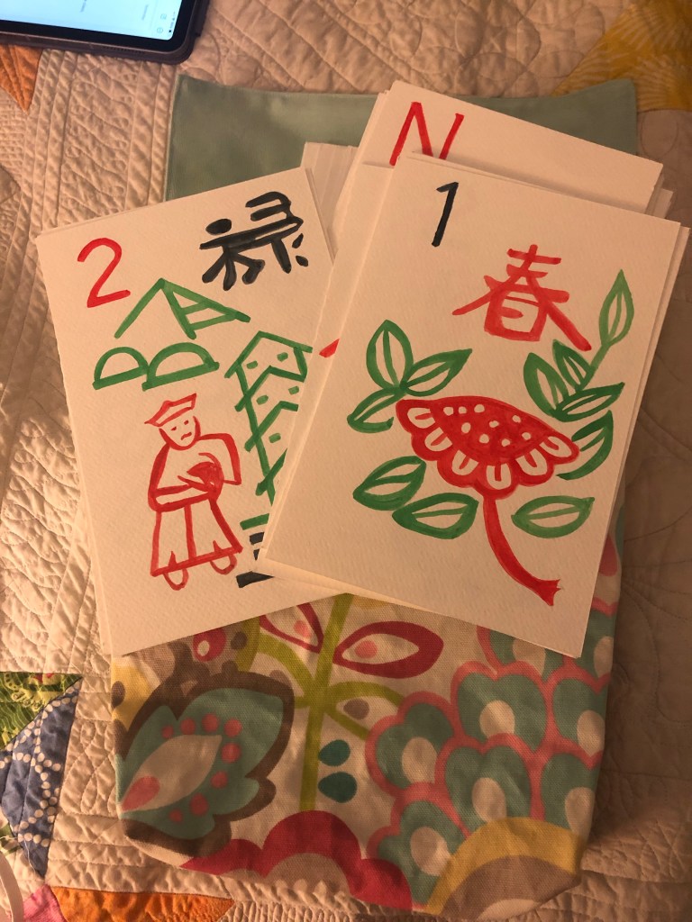 One of those scenarios is that someone allowed too many people to sign up for one of my classes by more than double. Now the crowd size is not an issue for me, but being able to make sure everyone in the class has a satisfactory experience is important to me. So with a months notice I painted these 6×9 inch Mah Jongg tile cards. I plan on using them in class to illustrate hands in a big enough format that people far from me can see.