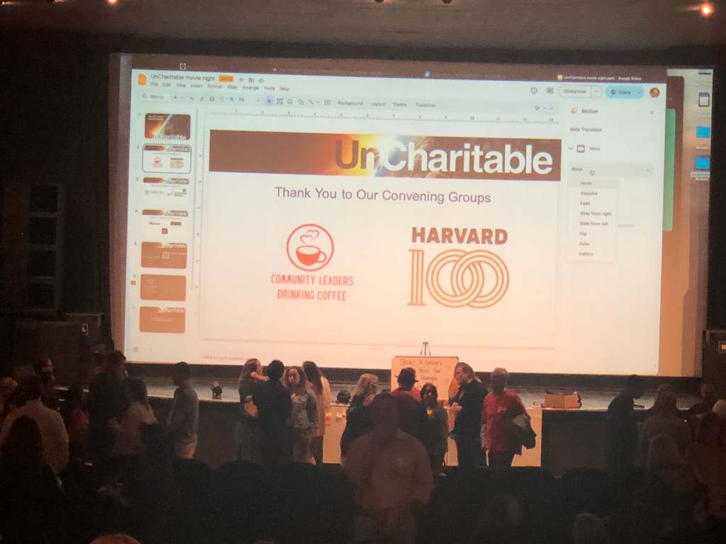 432 Non-Profit leaders gathered at the Rialto Theatre in Raleigh at an event sponsored by the Harvard 100, Chuck’s group and Community Leaders Drinking coffee, a non-profit leader groups started by Danny Rosin and Maggie Kane. The event was a screening of a movie called Unchairitable andthe unveiling of a succession planning tool.As a member of the Harvard 100 executive committee I was part of the planning group, but I was one of the least involved in the making of this event. Danny Rosin was the true leader. We only had a dream we could fill the Rialto theatre and in a very short time the event was sold out.