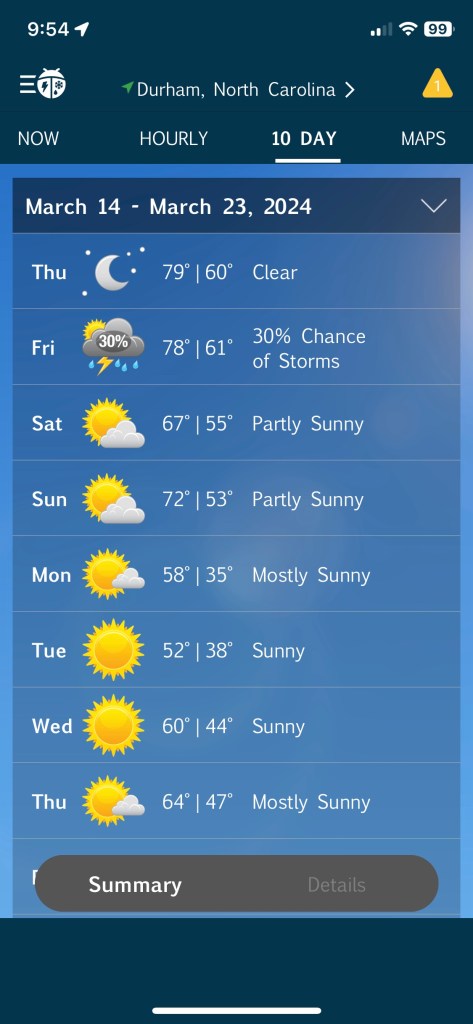 In Connecticut, spring came right around the time of the vernal equinox. In North Carolina spring really came in early February. Currently our daffodils are long gone and the forsythia’s yellow flowers have been covered by the green leaves.