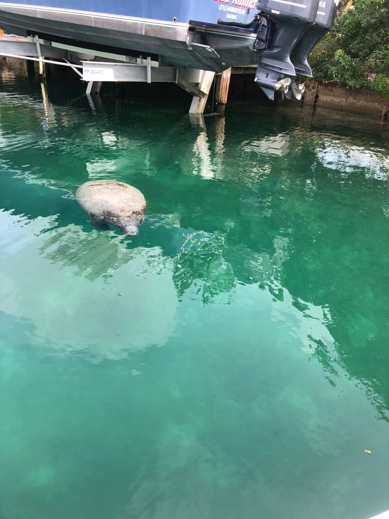 This afternoon Ruth E. took us out on her boat and we got to see a small Manatee that was hanging out by her house. As Ruth E. says, “They are the sloths of the sea world.” This little guy hardly moved, except for putting his snout out of the water for air every few minutes. It was a treat to see the houses from the water as we toured the canals.