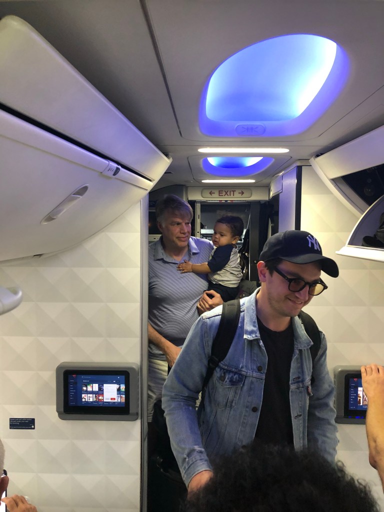 Russ enthusiastically said yes and she handed him the baby. He took to Russ and enjoyed his Birds Eye view of the airplane as Russ walked him down the aisle. He handed me the baby while he put his bag up and he was a cutie. The mother took him from me when she and the toddler eventually made it down the aisle.