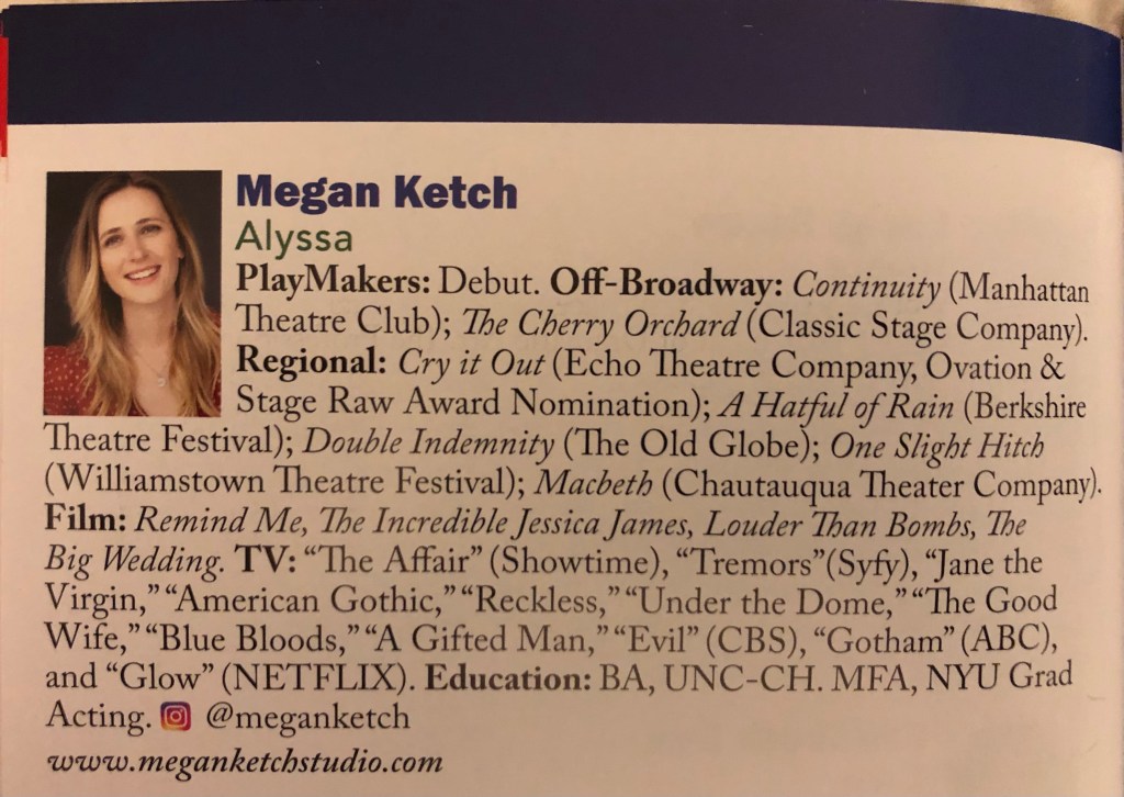 After UNC Megan moved to NYC and went to NYU for a masters in acting. Staring in NY based TV shows and movies and plays on the East coast for a few years. Eventually Megan made the move to LA and marrying her British actor heartthrob husband Max and having their own sweet baby. So having her back in North Carolina for this production is a huge treat.