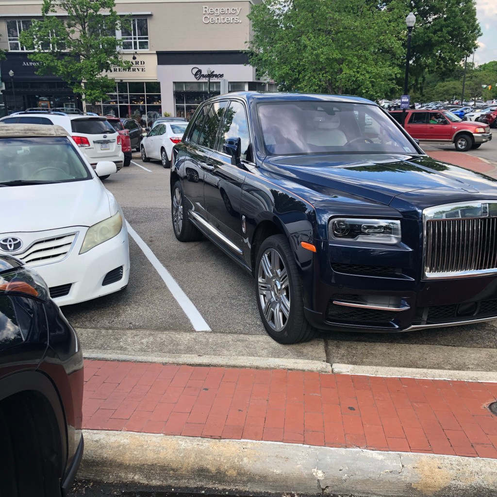 After the meeting, I went and taught a private lesson before I went to teach a class. I made a stop at Cameron Village before my class. I was a sitting in my car watching a man in a new Rolls Royce SUV trying to park. He pulled into a spot and got out and walked around the behemoth of a vehicle to make sure that if the 20 year old Toyota he parked next to could not hit his car with their door. He was not satisfied and got back in the Rolls and maneuvered it over a few more inches. He got out and checked again. He moved it a third time.