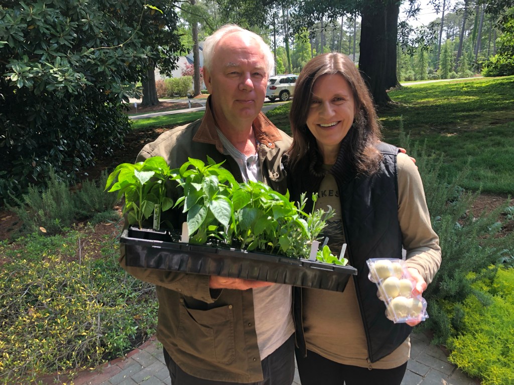 Posted: April 27, 2024 Filed under: Uncategorized 1 CommentI have been waiting all winter for Carter and Claire to come for a visit. We lucked into this beautiful weekend for it to happen. Before they landed Russ and I got a visit from our friends Iain and Angela bearing gifts of plants and eggs. Iain had grown too many plants for his garden from the seeds he started in January. We thankfully will get the opportunity to try and raise them into productive plants. I hope not to let them down.