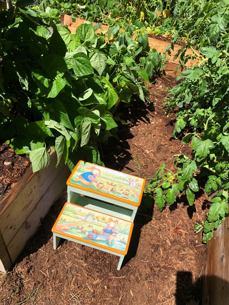Thank goodness we never got rid of the little peter rabbit stool. I am thankful to have it, but still would like to find my rolling stool and before green bean season passes.