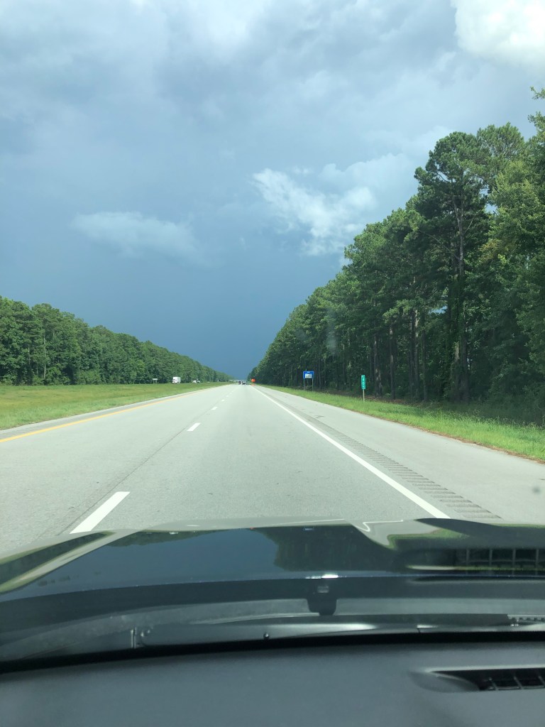 Posted: July 8, 2024 Filed under: Uncategorized Leave a commentAs I was driving 70 towards New Bern, I could see it. Off in the distance of this sunny, blue sky day, Rain. It was grey ahead, and getting darker. The trees on the side of the road separated me from the really dark grey. I was driving parallel to the river, now the rain highway.