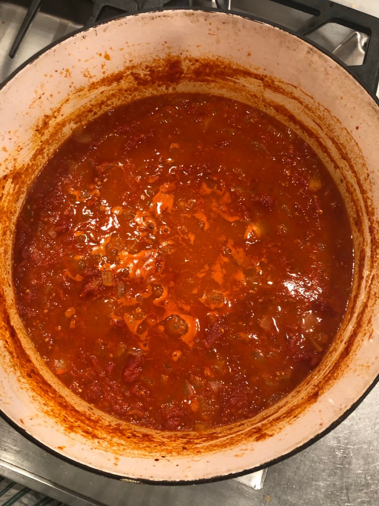 I started by making two tomato pies. Then I made a giant pot of tomato sauce. I used my largest Dutch oven and put in 30 tomatoes and two giant sweet onions. Cooked it for five hours and when it was all said and done it was two quarts. But it is beautiful, especially since I put in my fresh basil which has flourished when everything else failed.