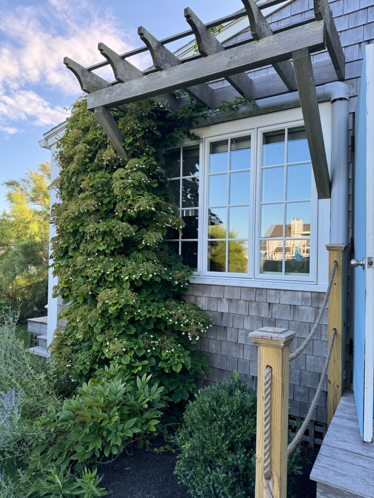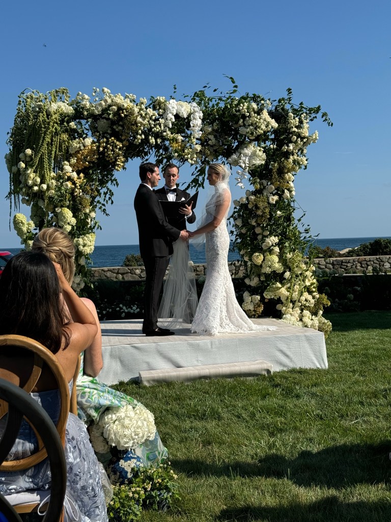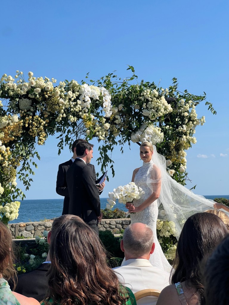 The day was surprisingly sunny and the yard was lush green with white hydrangeas and purple lavender in full bloom. The ceremony was set up in the grass with an alter of yellow and white flowers framing the deep blue sea just beyond the spot where Grace and Paul would be joined together.