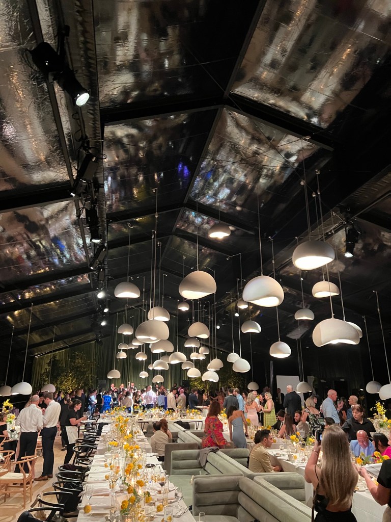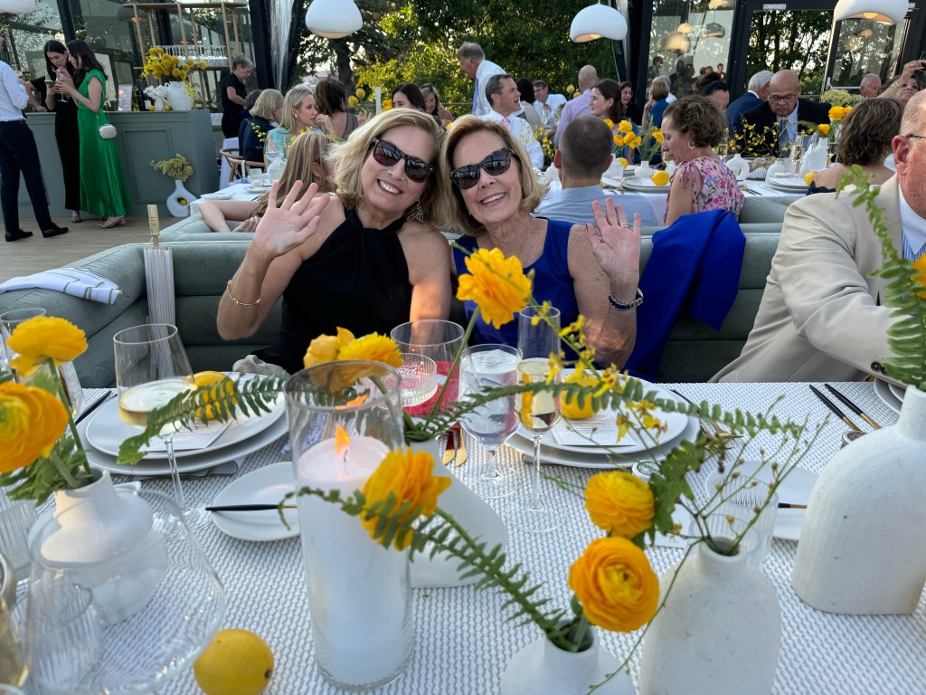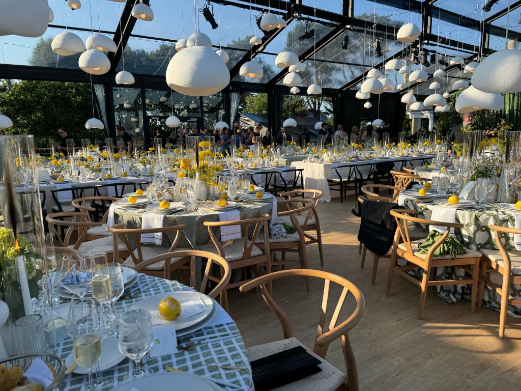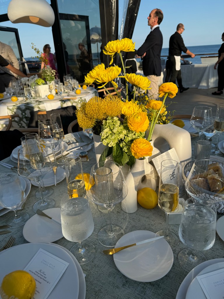 The dinner tables were a combination of rounds and long tables laden with ivory vases of varying shapes and sizes filled with every type of beautiful yellow flowers and lemons strewn about and used as place cards. Someone asked Grace about the theme of yellow and she said, “It is the color of sunshine and that is what Paul is.”