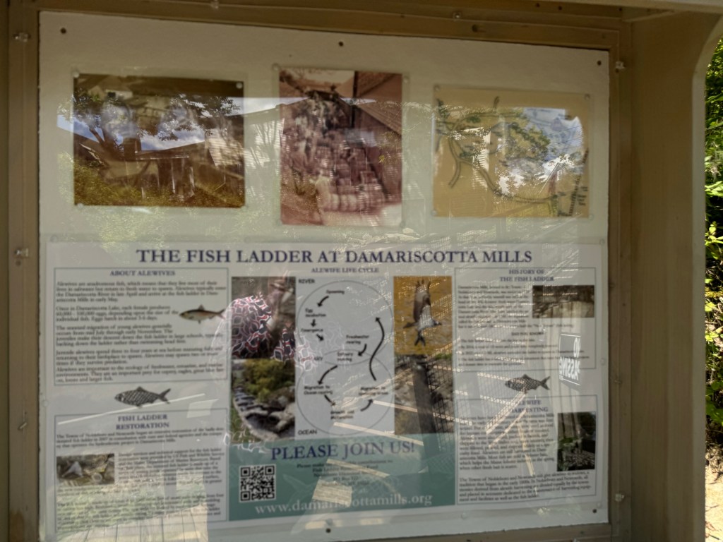 Yesterday when we were deciding where we would venture today I suggested we go south as we have done the northern route the past two visits. I knew that Damariscotta had their farmer’s market on Friday morning so it seemed like a good starting place. In the search of the internet I stumbled upon a curiosity I had heard of, but never witnessed; the Fish Ladder at the Damariscotta Mills. I asked Karen if she had ever seen a fish ladder. Neither had we seen one, we were felt our education had been lacking, as we went to high school together.