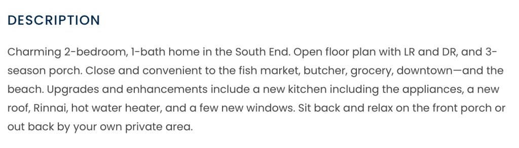 It is also curious that this new listing mentions the butcher second, because the butcher has gone out of business. The grocery store is more like a bodega. I’m sure if you don’t have a car you could survive on what they sell at that grocery, but you could never begin to afford the fish store. I can hardly afford that fish store. I drive up to Rockport and go to their fish store.