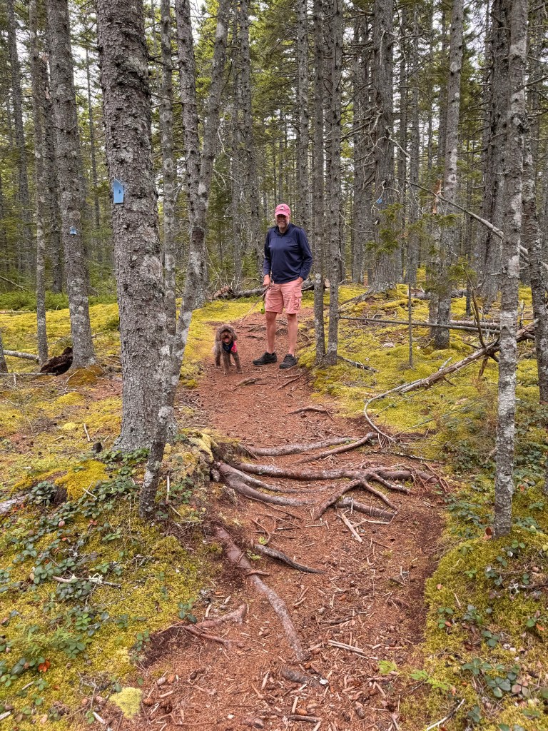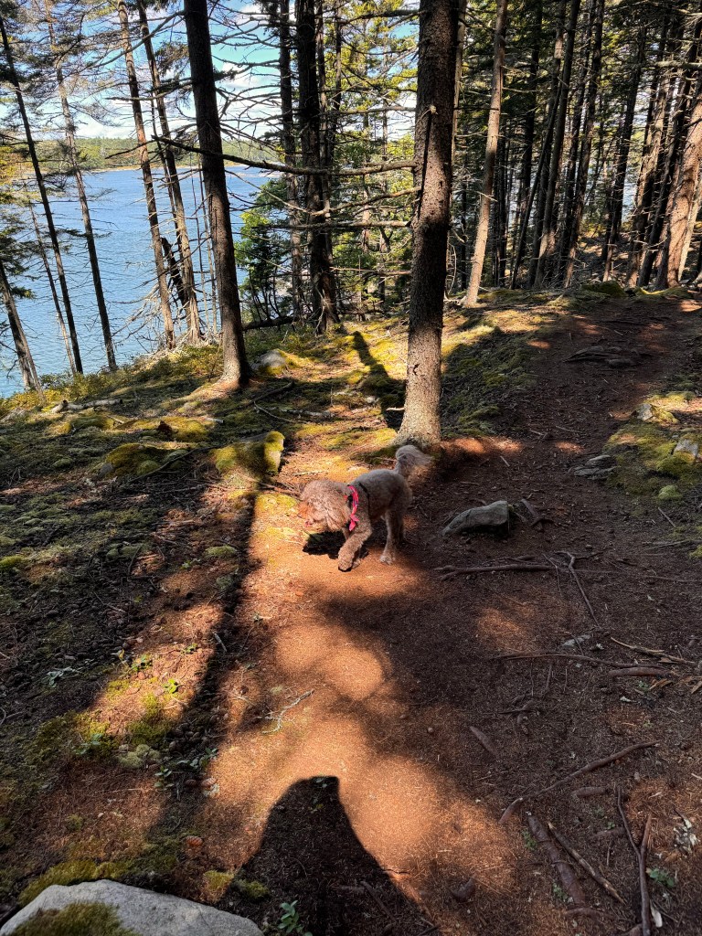 Shay, at 13 years old loves to hike. She insisted on leading the way. If she stopped to smell the markings and I passed her she quickly gave up the sniff to get in front of me. There was some elevation on this trail, but nothing too terrible. Going down is so much harder on me, but thankfully I did not trip on any of the exposed roots. It was sweet with the forest shade and the cool Maine Day.