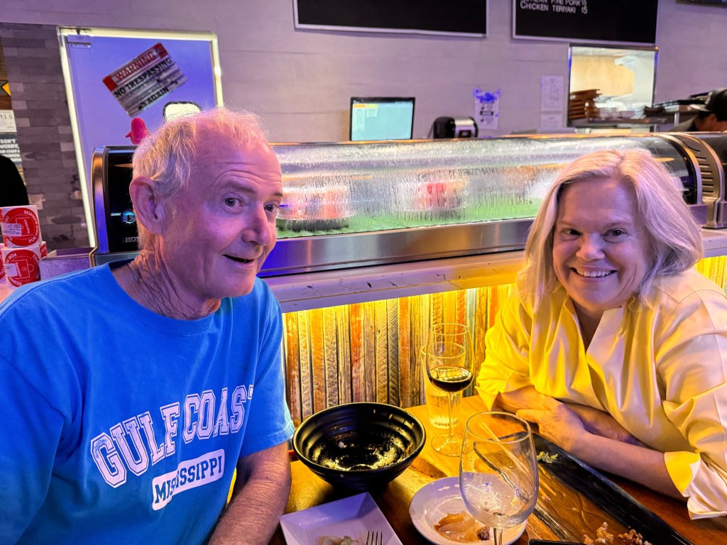 I digress. We had a little trouble getting a table, but after I had a little logical talk with the hostess and Warren was embarrassed that someone from the big city would point out some holes in the logic of why we couldn’t get a table, we got a table. Before that happened, two nice men from Tennessee invited me to sit with them, then it turned out a table of my mah Jongg students from the beach were sitting near by had to say hi, eventually Jane, Warren and I sat down together and got our sushi fairly quickly.