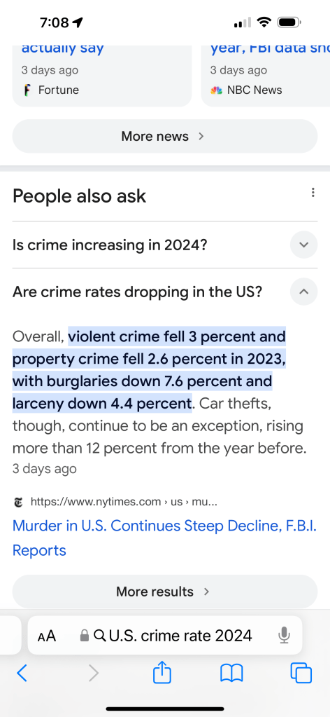 The crime rate has been going consistently down in all major categories, except car thefts, and maybe crimes committed by politicians.