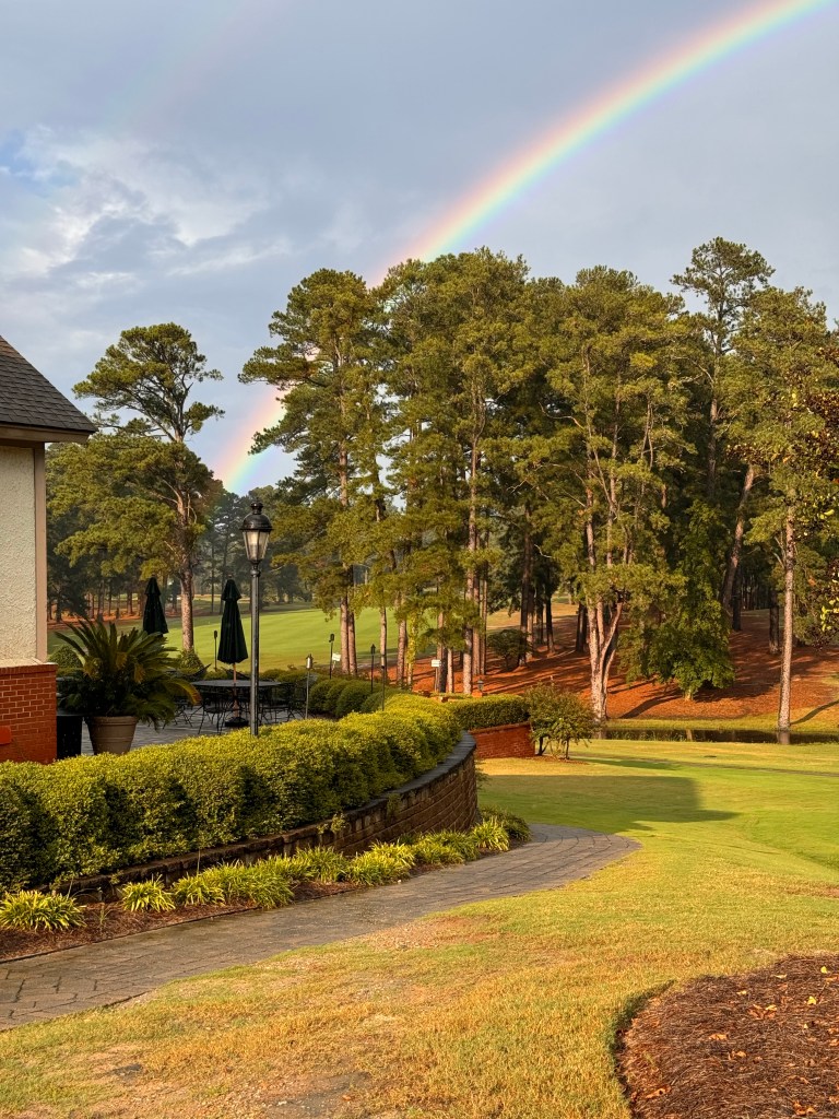 Eventually it did. I looked out my side window as I was about to get out of my car to run into the club and I saw the most perfect rainbow I have ever seen. It curved from one side of the ground to the other. The colors were so intense and well delineated.