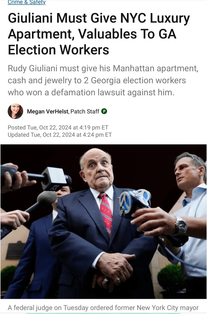 A court in NYC has ordered Giuliani to turn over his NYC apartment, his watch collections, old Mercedes and a jersey signed by Joe DiMaggio, along with jewelry, TV’s and furniture. It won’t come close to the $148 Million the court found him guilty for, but it is something. Who knows how much the lawyers are going to take. I think it would be fun for the women to go to NYC and spend a night in the apartment before it gets sold.