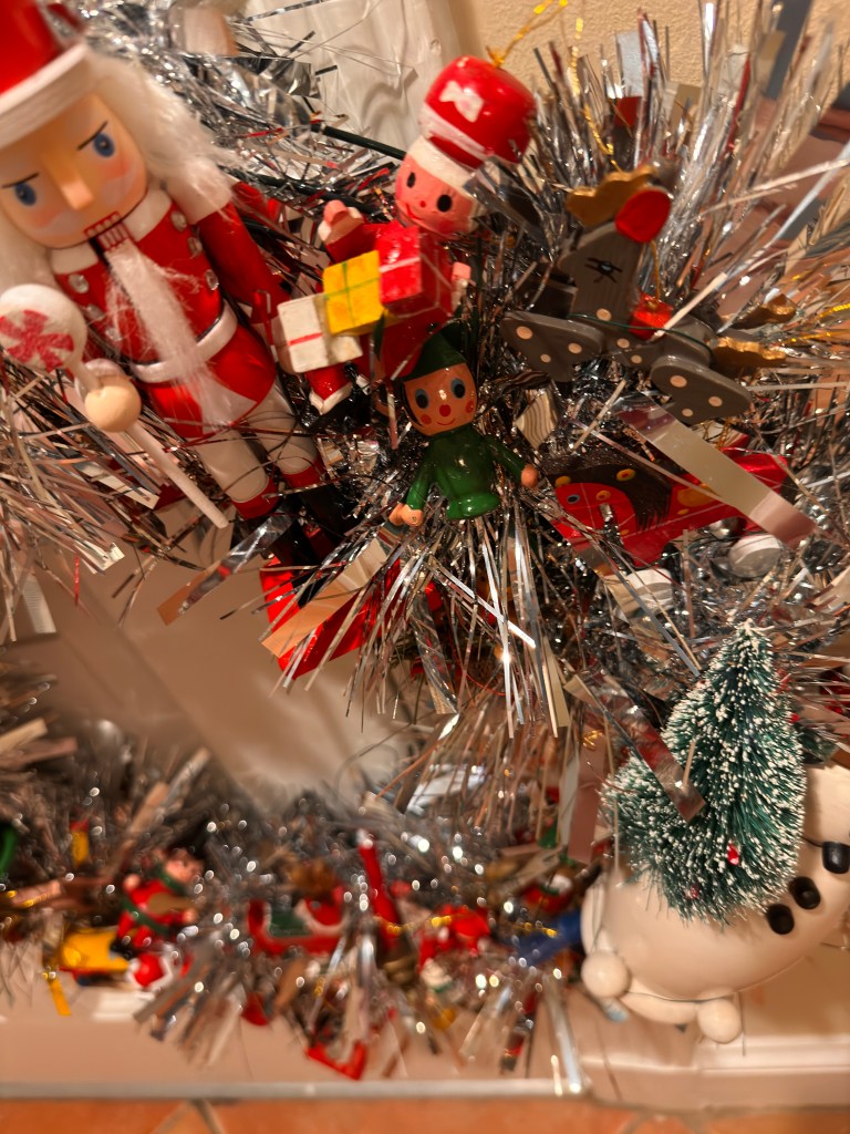 I could not find a premade tinsel wreath I liked so I bought two wire wreath forms, one slightly smaller than the other and wired them together to make a big enough base. I then wound the tinsel through the wire forms before attaching the wooden ornaments.