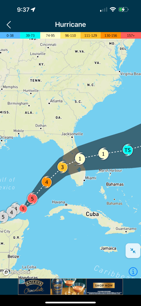 This Milton is going to be a bitch and no one deserves that kind of hit, let alone two in two weeks. Storm surge is a killer and water always wins. Poor Naples has barely gotten over their last big hit and if the storm moves any further south it could happen again. Tampa hasn’t had a storm like this in 100 years, but then again 100 years ago no one much lived there, it was too awful before air conditioning was invented.
