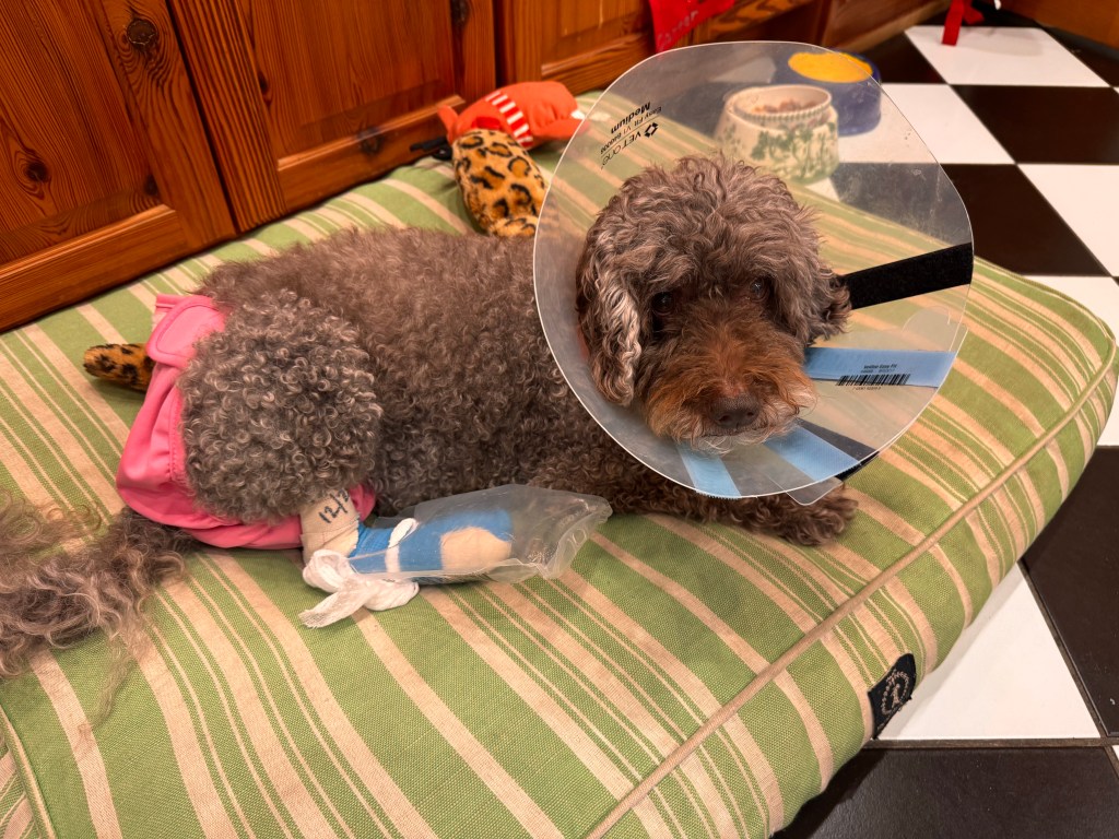 Last night we discovered that Shay had a hurt toe nail. First thing this morning we called the vet and texted a photo. The word came back that she needed to go in to see the Doctor. She had split the nail all the way down to the quick, which was starting to get infected and it had to be removed. Russ and Carter had to leave her there while they did the procedure. What came home was a very drugged up baby, with a cone and a wrapped foot, which Russ called her flat tire.