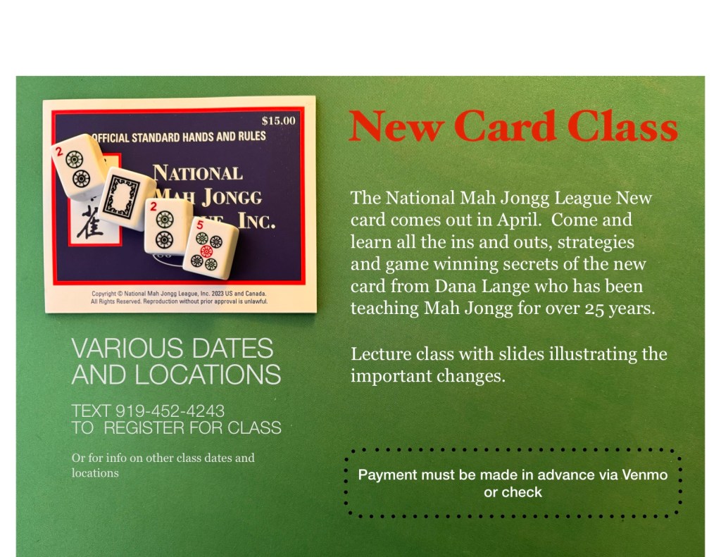 Remember to order your new card now from the National Mah Jongg league. The sooner you order it the more likely you are to receive it by April 1. There are no guarantees when it comes to card deliveries.