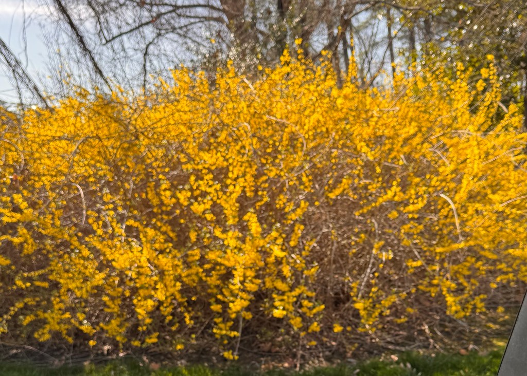 With spring break at home now I am enjoying the blooming of the forsythia and the first 80 degree day of spring. It is beautiful all week. The air is soft and the brightness of the new growth green is everywhere.