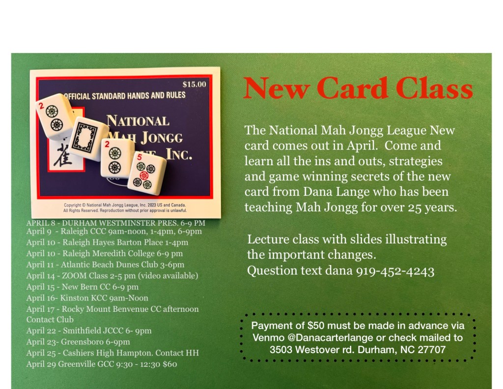 If you want to get a leg up when the new card comes out come join me at one of my classes. Visit my website www.learnmahjongg.com to find my classes. I promise it will informative and entertaining.