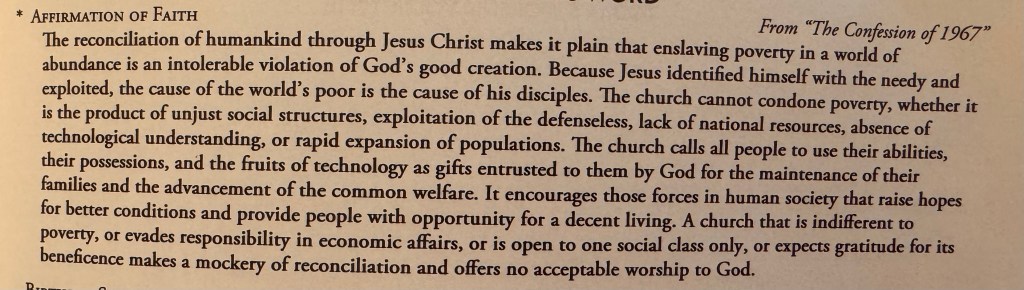 The Presbyterian church gathered to write the confession of 1967 in response to our times, but it feels very familiar to our current times. The joy I got from reading this was not that times are bad now, but that they were bad then and then things improved. The fact that they don’t stay good or bad is nothing new.