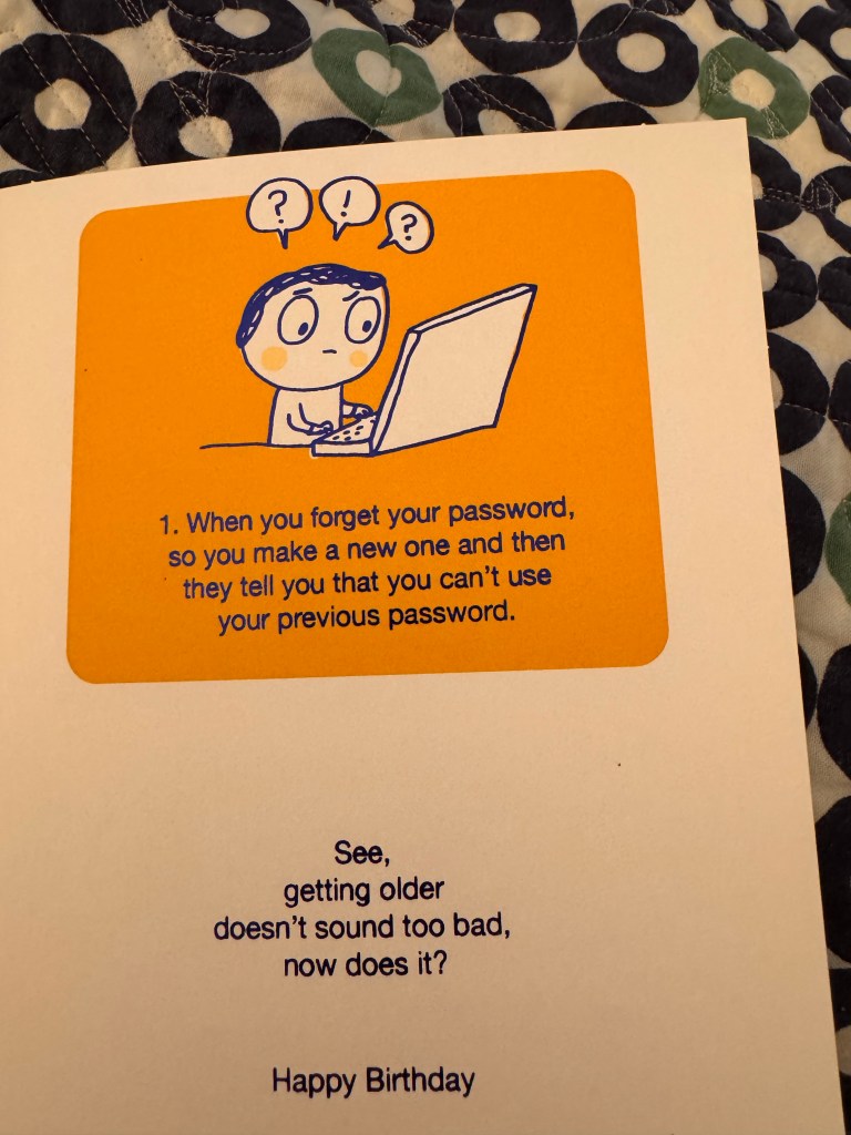 Posted: May 5, 2025 Filed under: Uncategorized Leave a commentBirthdays are a good excuse to be with friends. Aging with friends makes it so much better. My friend Michelle gave me a card that says it perfectly.