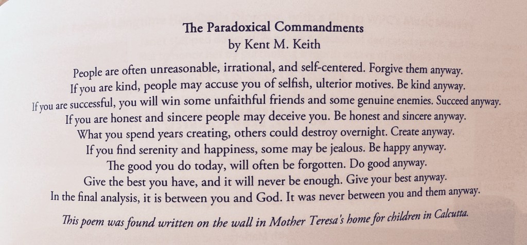 Posted: June 30, 2025 Filed under: Uncategorized Leave a commentThe poem, “The Paradoxical Commandments” by Kent Keith was printed in our church bulletin this week. You may know it.