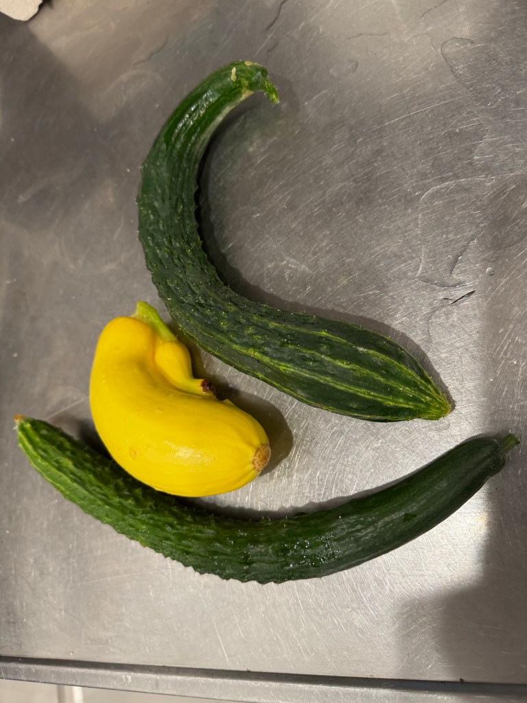 Farming is heart breaking. It is hard to grow perfect looking food. But why does it need to be perfect to look at if it is perfect tasting? A yellow squash with a tailgater will not even be recognizable once I cut it up and cook it. A girthless cucumber, once peeled and chopped will make delicious gazpacho. The good news about those thin cucumbers is that they can’t have too many seeds yet.